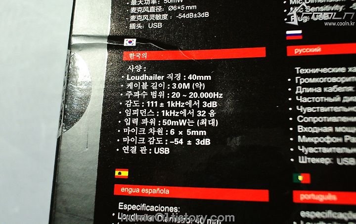 각국의 언어로 제품에 대한 간단한 스펙이 기재되어 있습니다.
