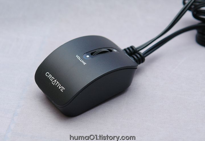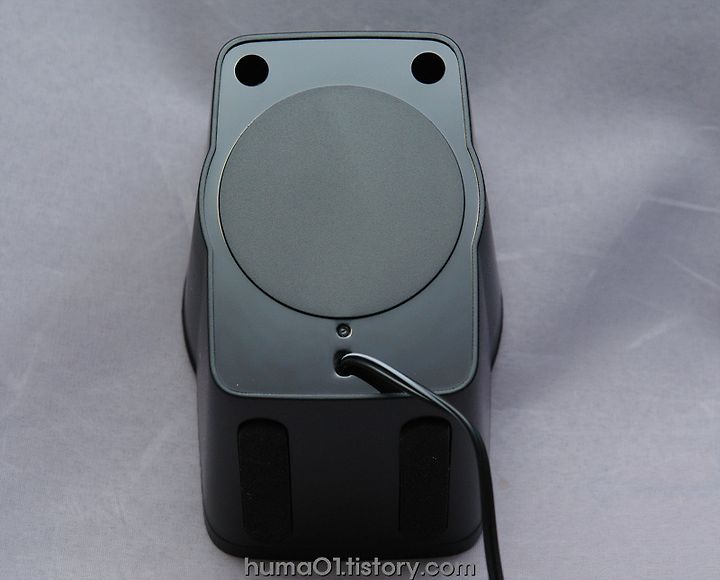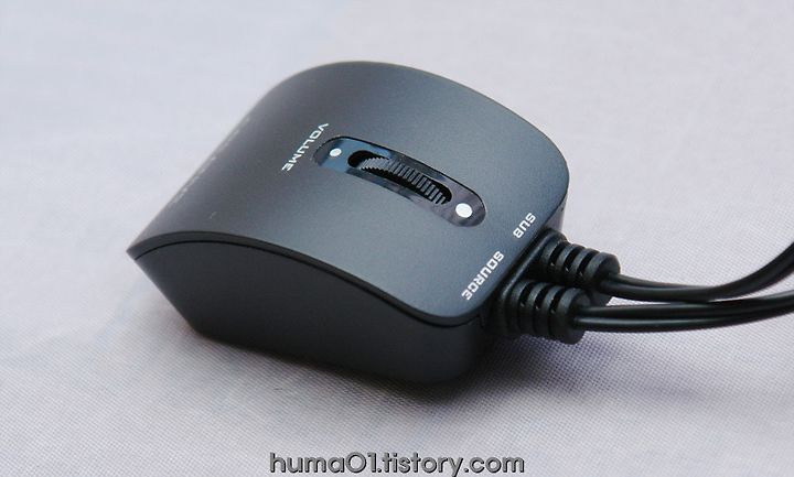 직사각형의 전통적인 큐브타입 서브우퍼/ 위성스피커2EA/ 볼륨조절을 담당하는 마우스(?)스러운 컨트롤러
